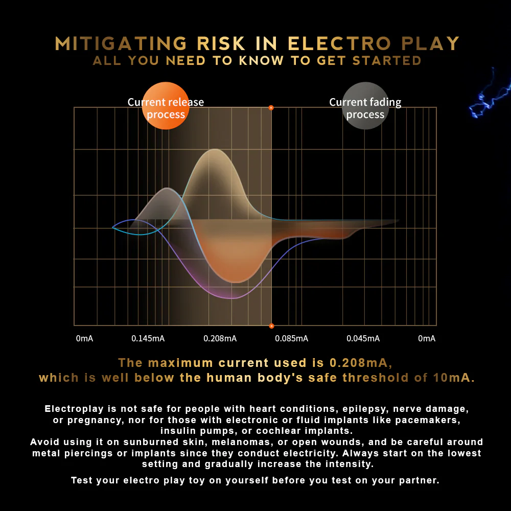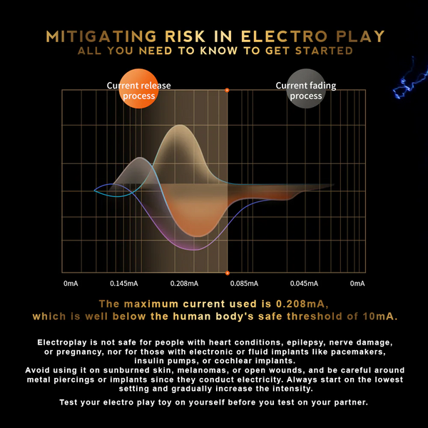 Safety Note: The maximum current used is 0.208mA, which is well below the human body's safe threshold of 10mA. Electric canes, whips, and paddles are designed for gentle spanking only, NOT for hard impact play.
